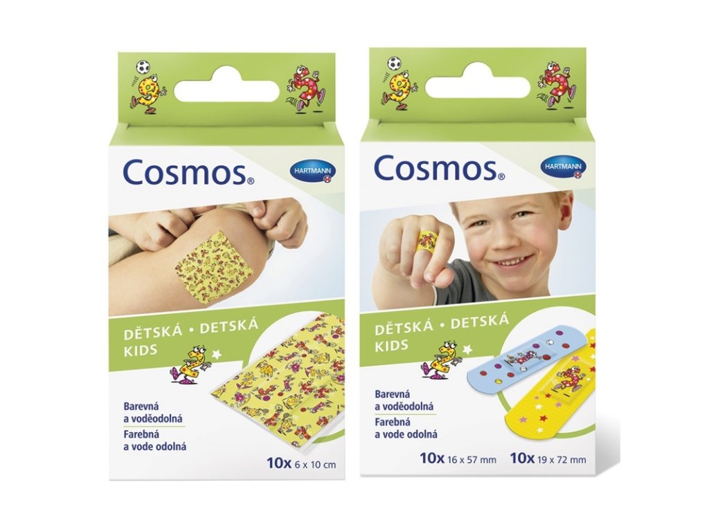 Dětská náplast Cosmos je k dispozici ve třech provedeních, včetně antibakteriálních náplastí s ionty stříbra.